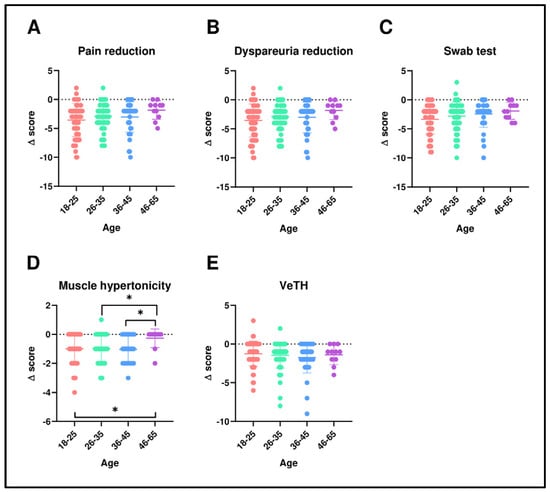 Comparison of deltas stratified by age groups for pain (A), dyspareunia (B), swab test (C), muscular hypertonicity (D), and vestibular trophism (E). Statistical analysis was performed using the Wilcoxon signed-rank test for paired data. * p = 0.05.