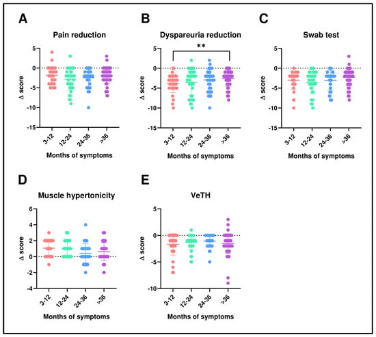 Comparison of deltas stratified by months of symptoms groups for pain (A), dyspareunia (B), swab test (C), muscular hypertonicity (D), and vestibular trophism (E). Statistical analysis was performed using the Wilcoxon signed-rank test for paired data. ** p < 0.01.