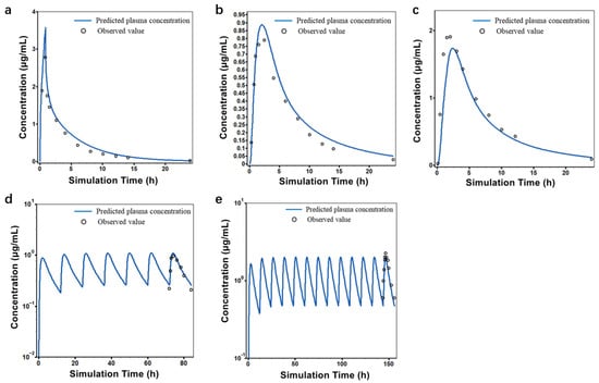 Clarithromycin is a small-molecule compound with good lipid solubility. Thus, the default perfusion-limited model was selected, and the steady-state volume of distribution and tissue–plasma partition coefficients were calculated using the Poulin–Theil homogeneous method. Multiple literature sources indicate that clarithromycin can inhibit CYP3A4- and P-gp-mediated metabolism and transport; however, it is primarily metabolized by CYP3A4, with a small portion excreted through the kidneys [24]. Therefore, P-gp parameters were not set in the transporter module, and the Michaelis constant (km) and the maximum rate (Vmax) for CYP3A4 were input based on literature reports and IVIVE conversion. Furthermore, a nonspecific renal clearance rate of 7.9 L/h was included in the model. Furthermore, literature reports indicate that clarithromycin has low bioavailability due to a significant intestinal first-pass effect (FPE), with an FPE value set to 25% as determined from the relevant literature [25]. Table S1 presents the specific physiological parameters and clearance rates used in the model. Clinical trial data on the intravenous infusion (250 mg) and oral forms (250 and 500 mg) of clarithromycin were used to evaluate and validate the model’s performance.