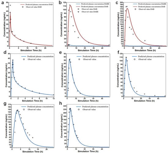 The PBPK model for DAB following intravenous administration was developed using plasma concentration data to describe the active component’s distribution, metabolism, and excretion. Table S2 lists the specific modeling parameters. Based on Caco-2 measurements, DAB has a low apparent permeability and a high volume of distribution (range = 0.88–1.05 L/kg), suggesting that peripheral tissues are perfusion-limited. The tissue–plasma water partition coefficients were calculated using the Rodgers, Leahy, and Rowland method [26,27,28]. The metabolism module included only UGT2B15-mediated metabolism, with the Michaelis constant (km) and maximum rate values (Vmax) taken from the literature and converted into in vivo UGT2B15 metabolism parameters using the IVIVE module [14]. Drug elimination was set in the kidney compartment at a rate of 7.1 L/h. After inputting the required modeling parameters, plasma concentration–time data for intravenous DAB (250 mg) were placed in the corresponding folder, and a PBPK simulation was performed according to the physiological information of healthy individuals.