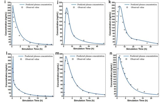 Table 3 presents the estimated input parameters for edoxaban, along with the observed and predicted concentration–time curves shown in Figure 2l–n. The established edoxaban PBPK model predicted the plasma concentration–time curve of a 30 mg intravenous administration in healthy subjects, as shown in Figure 2l. The model was further evaluated by predicting plasma concentration–time curves after the oral administration of 60 and 90 mg edoxaban in healthy subjects, as shown in Figure 2m,n. The FE values for Cmax, Tmax, and AUC0-t were close to 1, confirming the successful establishment of the edoxaban PBPK model.