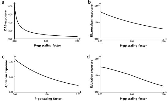 Figure 3 presents the results of the parameter sensitivity analysis. The horizontal axis represents the magnitude of the P-gp maximum reaction velocity (baseline = 1), whereas the vertical axis represents the change in drug exposure in vivo (baseline = 1). The results indicated that in vivo drug exposure was affected by the P-gp Vmax, which decreased with an increasing Vmax. Therefore, if P-gp is inhibited in vivo, the exposure levels of novel oral anticoagulants will increase.