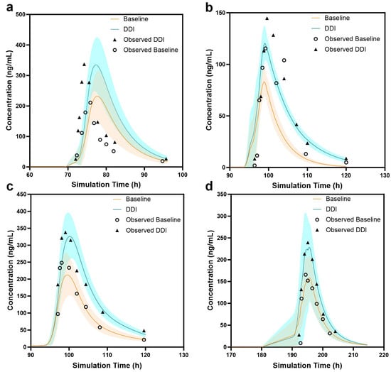 Clarithromycin with DABE: Compared with the baseline predictions, the DDI prediction showed an increase of 61% in Cmax and 56.2% in AUC0-inf, and the corresponding clinical observation data revealed that the Cmax increased from 174 ng/mL to 294 ng/mL, indicating that it increased by 68%. The similarity between the predicted and observed results indicated the successful establishment of the PBPK model for the coadministration of clarithromycin and DABE. Meanwhile, we observed that the predicted values were slightly larger than the observed values, which may be due to the random sampling of PK simulation samples in the population, making it impossible to fully reproduce clinical observation values.