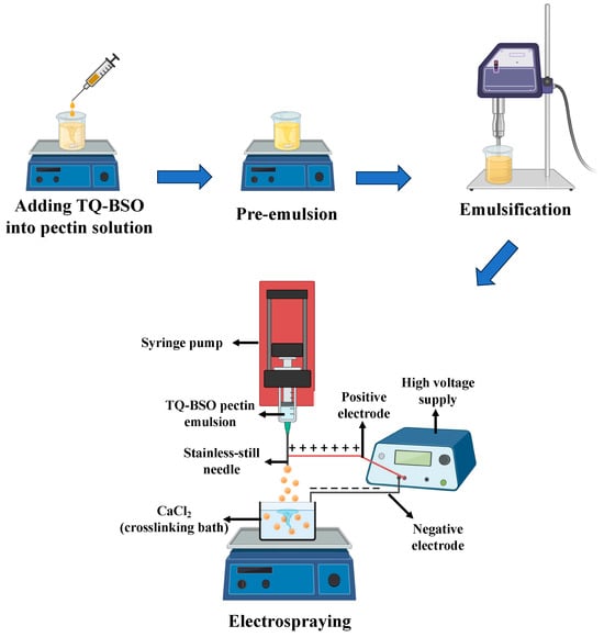 TQ-loaded pectin beads were prepared using the electrospray technique based on the ionic gelation method, as described previously [26] and illustrated in Figure 1. The setup consisted of a high-voltage power supply, a syringe pump, a syringe equipped with a stainless-steel needle, and a cross-linking bath (Figure 1) [27]. Initially, an aqueous pectin solution containing 2.5% (w/v) of Tween 80 was prepared in distilled water, with continuous stirring maintained overnight. Next, TQ dissolved in 1.5 mL of black seed oil (BSO) was added dropwise to 10 mL of the pectin solution while stirring magnetically until a homogeneous mixture was obtained. This mixture was subsequently delivered through a syringe pump (Model: 1000-US/SyringeONE, New Era Pump Systems, Farmingdale, NY, USA) at a constant flow rate of 0.5 mL/min. The solution was electrosprayed into the cross-linking bath by applying a high voltage to the stainless-steel needle (24 G), positioned 5 cm from the collector. The beads underwent gelation under gentle stirring at 250 rpm for 30 min at room temperature. The cross-linked beads were subsequently collected, washed twice with distilled water, and air-dried at 40 °C.