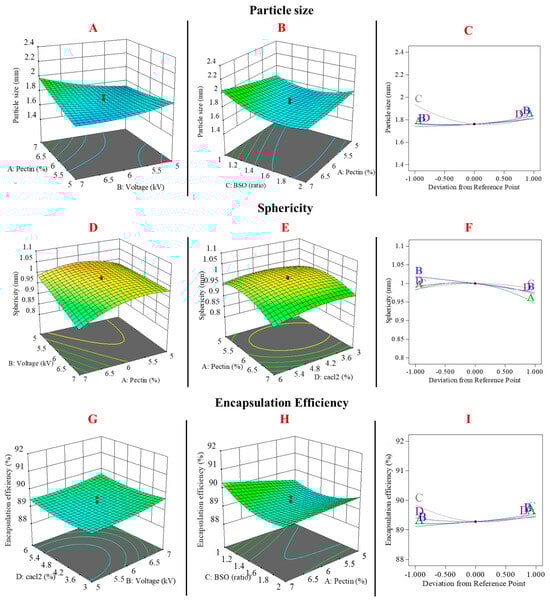 Illustration of the relationship between the design factors with particle size (nm) (A–C), sphericity (D–F), and encapsulation efficiency (%) (G–I) as the response variables.
