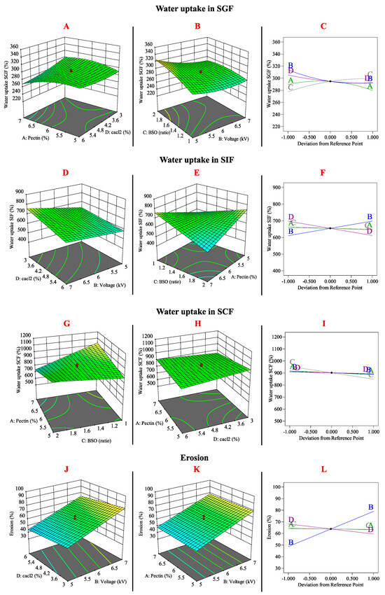 Illustration of the relationship between the design factors with water uptake in SGF (A–C), SIF (D–F), and SCF (G–I) and the erosion (J–L) of the TQ-PB as the response variables.