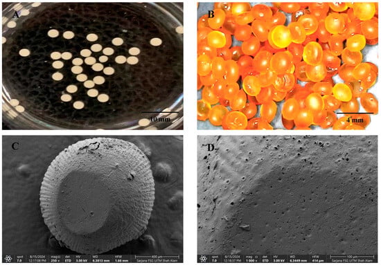 The size of the beads was determined by capturing digital images with a camera and analysing them using ImageJ software version 1.46 r (National Institutes of Health, Bthesda, MD, USA). The length and width of 20 beads were measured, and the average of these two dimensions was used to calculate the size. Sphericity, an indicator of the roundness of the beads, was estimated by measuring the maximum and minimum diameters of 20 beads [28]. The sphericity was calculated using Equation (1).