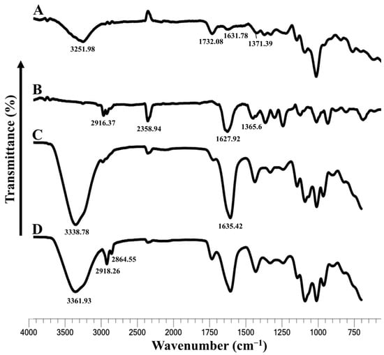 Presents the FTIR spectrum of pectin (A), thymoquinone (B), blank PB (C), and TQ-PB (D).