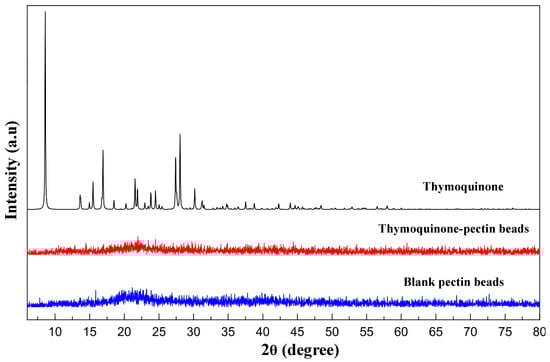 The PXRD technique enables assessment of the prepared beads in terms of crystallinity and confirms whether the active ingredient is successfully entrapped within the beads. The PXRD results for electrosprayed beads are presented in Figure 6. Notably, the XRD patterns of both blank and TQ-PB prepared by electrospray technique display no sharp peaks, unlike the sharp peaks observed in crystalline thymoquinone. This absence of sharp peaks suggests that the active ingredient is homogeneously dispersed within the pectin polymer network, facilitating effective thymoquinone encapsulation and making the beads suitable for potential sustained release. Consistent with previous studies [53,54,55], this beading process promotes amorphisation of the active ingredient, enhancing entrapment and encapsulation.