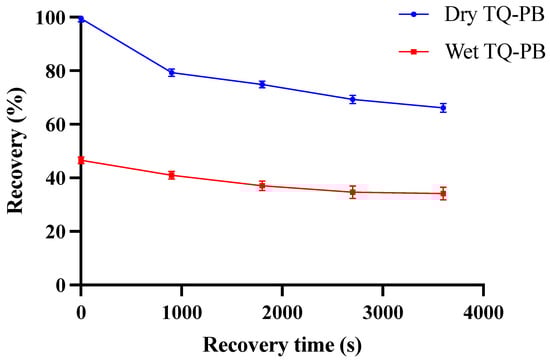 The recovery plot (Figure 7) demonstrates that TQ-PBs exhibit both elastic and plastic behaviour in their dry and wet forms, respectively, under compression. The percentage recovery of TQ-PB reflects their response to progressive deformation over time, such as 10% deformation at 0 s, 20% at 900 s, 30% at 1800 s, 40% at 2700 s, and 50% at 3600 s. This progression provides insights into the beads’ behaviour under varying levels of compression, as well as their adaptability to different gastrointestinal (GI) environments.