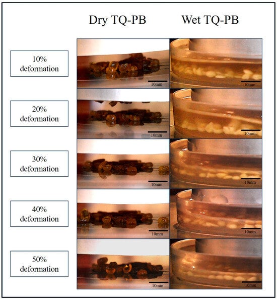 Optical images of dry and wet TQ-PB at various deformation levels (10–50%).