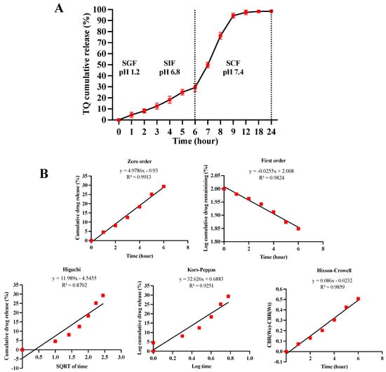Illustration of the cumulative release profile of TQ from pectin beads in three different body mimicking fluids: SGF (pH 1.2 ± 0.1) for 2 h, SIF (pH 7.4 ± 0.1), and SCF (pH 6.8 ± 0.1) until complete TQ release (A), and the release kinetic models of the TQ (B) zero-order model, first-order model, Higuchi model, Korsmeyer–Peppas, and Hixson–Crowell model.