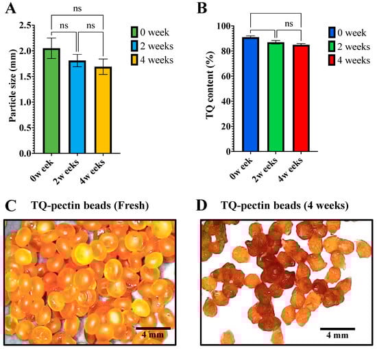 Illustration of the changes in particle size (A), TQ content (B), and the shape of TQ-pectin beads freshly prepared (C) and over the storage period at 40 °C ± 2 °C and 25% RH ± 5% RH (D).