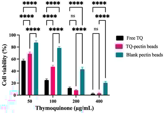 The cytotoxic effects of free TQ, TQ-PB, and blank pectin beads on HT-29 cell lines were evaluated using the MTT assay over a 24 h period. Figure 11 demonstrates that HT-29 cell viability was influenced by the concentration of TQ, with blank pectin beads exhibiting significantly lower cytotoxicity compared to both free TQ and TQ-PB. Similarly, a dose-dependent cytotoxicity observed in this study is supported by a previous study, which noted a comparable response of TQ against HT-29 cells [61]. Over the concentration range of 50–400 μg/mL, the half-maximal inhibitory concentration (IC50) was determined to be 56.24 ± 2.8 μg/mL for free TQ, while for TQ-PB, it was significantly higher at 80.59 ± 2.2 μg/mL. The variation in IC50 values between free TQ and TQ-PB is likely due to the controlled release of TQ from the pectin matrix, which degrades in the presence of the pectinase enzyme. These findings are consistent with prior research by Sookkasem et al. (2017), who reported higher cytotoxicity for free curcumin compared to curcumin encapsulated in pectin beads in a colon-targeting delivery system [56]. The moderate cytotoxicity observed for the blank pectin beads is consistent with previous findings on pectin-based delivery systems. For instance, Chittasupho et al. (2013) demonstrated that pectin nanoparticles conjugated with methotrexate exhibited moderate cytotoxic effects against hepatic cancer cells, especially at elevated pectin concentrations [62]. This correlation highlights the influence of pectin content in driving cytotoxic activity, even in the absence of an active therapeutic agent.
