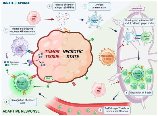 The relationship between tumor growth dynamics and changes in the TME is highly complex due to the behavior of the immune system, which is mainly responsible for this complexity. Figure 1 illustrates this relationship in a simplified way, which is based on the cancer-immunity cycle described by Mellman et al. [6]. Briefly, dendritic cells (DCs) recognize and engulf neoantigens and damaged associated molecular patterns (DAMPs) produced by dead tumor cells, activating the circulating naive T cells that link the innate and adaptive immune responses. However, it is the balance between immune activation and suppression that determines whether a tumor will proliferate or be eliminated. The antitumor response is induced by DC, M1 macrophages, CD4+ T cells, and cytotoxic CD8+ T cells [7,8,9,10]. On the other hand, tumor resistance is derived from M2 macrophages, myeloid-derived suppressor cells (MDSCs), and regulatory T cells (Treg) [11,12,13].