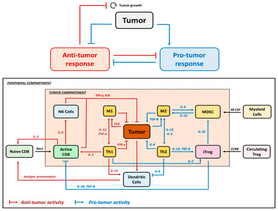 Understanding the TME, its elements, and the immune framework is essential to determine the impact of effector CD8+ T cells alongside Treg. Figure 2 depicts the main processes involved in either (i) tumor elimination (represented in red) where CD8+ T cells are essential, or (ii) tumor progression (represented in blue) where Treg are the main responsible elements. In addition, coordination across lymphocytes CD8+, CD4+, Treg, NK cells, macrophages M1 and M2, MDSCs and DCs is required to regulate the development and progression of the disease. Integrating these processes with their corresponding biomarkers into a mathematical framework that replicates the most complex immunological state triggered by the presence of a tumor is the most challenging exercise in predicting the final immune response.