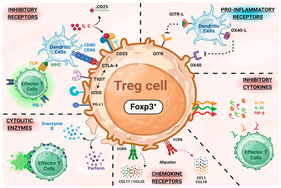 Schematic representation of the different biomarkers expressed in Treg and involved in the different mechanisms of action identified for this lymphocyte subset. Note that Foxp3 is expressed intracellularly and determines Treg activation.