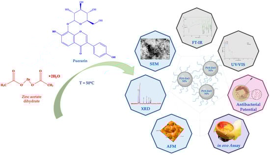 In this context, the purpose of the current study was (i) green synthesis and characterization screening of puerarin-functionalized zinc oxide nanoparticles (abbreviated in our study as PUE-ZnO NPs), without the use of any additional reducing agents; (ii) antimicrobial potential evaluation; and (iii) assessment of in ovo angiogenic and anti-irritative potential (Figure 1). To our knowledge, there is no other report on the synthesis of zinc oxide nanoparticles using puerarin, physicochemical characterization, antimicrobial potential, and in ovo effects of such nanobiocomposites. Various applications can benefit from the synthesis of ZnO nanoparticles by using puerarin, including pharmaceutical and cosmetic products, cancer therapy, drug delivery, and photocatalytic materials.