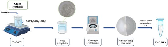 Briefly, 50 mL of preheated puerarin solution was added into a flask containing 50 mL of zinc acetate dihydrate solution. After 60 min of heating the solution with a magnetic stirrer at 50 °C, it turned milky white, which is a sign of particle formation, and then it uncolored because of particle precipitation. After this, the solution was centrifuged at 10,000 rpm for 10 min, then the supernatant was discarded. The precipitate was collected, washed with distilled water five times to remove any impurities, and dried at room temperature for 24 h (Figure 2). The resulting dried product (PUE-ZnO NPs) was stored for further analysis.