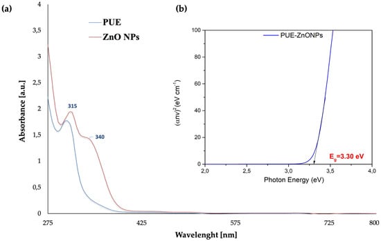 The PUE-ZnO NPs possess a calculated optical band-gap energy (Eg) of 3.30 eV, which is well matched with the literature reports of ZnO NPs synthesized using different methods [58,59,60,61], but also suggests future applications as a photocatalytic nanomaterial because the photocatalytic activity is more effective when the band-gap value is lower [62,63].