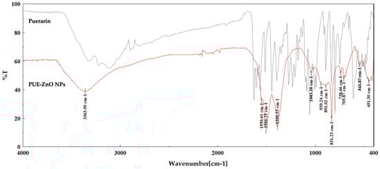 This investigation was performed to demonstrate the formation of zinc oxide nanoparticles with the included isoflavone. Figure 5 shows the FT-IR spectra of the synthesized PUE-ZnO NPs compared to pure puerarin, in the wavenumber range of 4000–400 cm−1.
