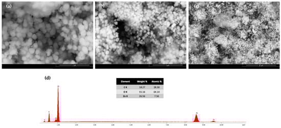 SEM analysis images of PUE-ZnO NPs obtained at different magnification: (a) 2 μm, 50,000×; (b) 4 μm, 25,000×; and (c) at 10 μm, 10,000×; (d) EDX spectra recorded for PUE-ZnO NPs.