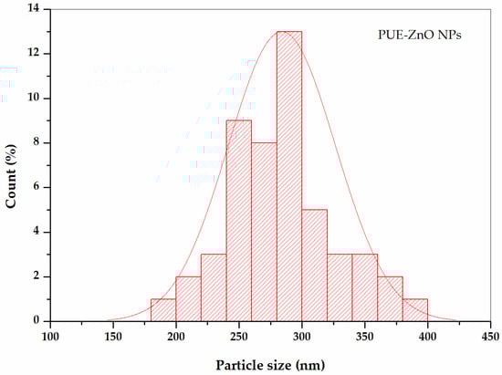 The particle size measurement was determined also by using Image-J software for at least 100 particles, based on PUE-ZnO NPs SEM images. The majority of PUE-ZnO NPs were counted in the size range between 200 and 400 nm, with a few being counted below 200 nm. The histogram for the size distribution of PUE-ZnO NPs (Figure 7), which indicates an average particle size of ~278 nm.