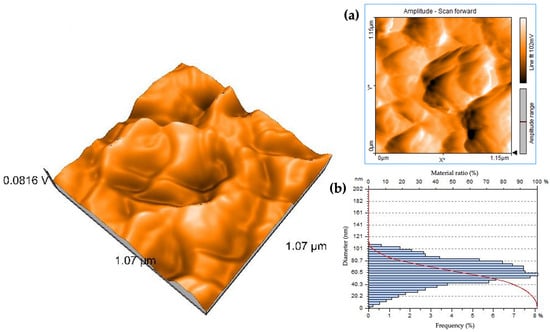 The topography of the PUE-ZnO NPs was investigated by Atomic Force Microscopy (AFM) using a Nanosurf® EasyScan 2 Advanced Research AFM (Liestal, Switzerland). The sample was ground in a mortar with ethanol and then transferred onto a silica glass plate. It was then dried at a temperature of 25 °C. Non-contact mode was used to record the two-dimensional (2D) and three-dimensional (3D) images, with a scanned surface measuring 1.1 μm × 1.1 μm. Nanosurf EasyScan 2 computer software was used to calculate roughness parameters, which included average surface roughness (Sa, nm), maximum peak height (Sp, nm), and maximum valley depth (Sv, nm).