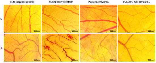 Representative images of PUE-ZnO nanoparticles evaluated using the HET-CAM method. Stereomicroscopic images of the chorioallantoic membrane after treatment with H2O (negative control), SDS 0.5% (positive control), and test samples at a concentration of 100 μg/mL; images represent the CAM area of administration before sample application (t0) and five minutes after application (tf), by stereomicroscopy, 3.2× magnification.