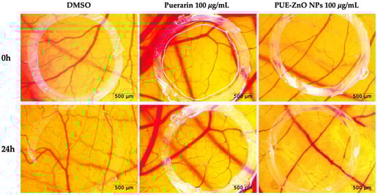 In a similar manner to the previous method, we applied DMSO, puerarin, and PUE-ZnO NPs to the chorioallantoic membrane and monitored stereomicroscopically to identify if any inhibition of the angiogenesis process was possible. After 24 h post-treatment, no relevant modifications or anomalies were observed concerning the normal developing vessel architecture, which indicates that the angiogenesis process was not affected (Figure 10). Thus, it can be concluded that ZnO nanoparticles synthesized through a green chemistry pathway, at a concentration of 100 μg/mL, exhibit good vascular tolerance.
