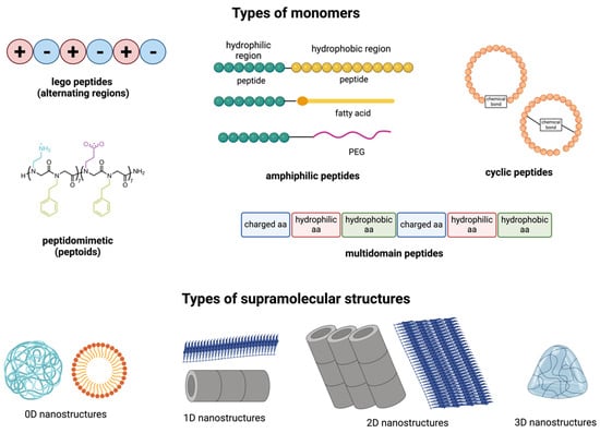 Main categories of peptide monomers that can form biomaterials by self-aggregation. According to the monomers and the interactions between monomers, the self-assembled structure can be a sphere (0D nanostructure), a tube (1D), a fibre (1D), a sheet (2D), or a hydrogel (3D). Created with Biorender.com.
