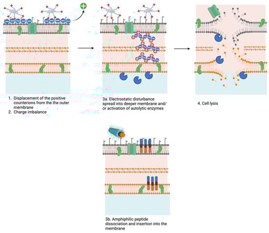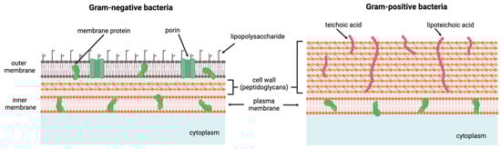 AMPs are peptides that effectively target pathogens and are part of the innate immune system, exhibiting potent activity against a broad range of bacteria, both Gram-positive and Gram-negative bacteria that show different structural features (Figure 2). Their primary mechanism of action relies on interactions with bacterial membranes, leading to membrane disruption. To achieve this, AMPs must possess both a positive charge to facilitate electrostatic interactions with the negatively charged bacterial membranes and a hydrophobic component that allows them to insert into the lipid bilayer and cause membrane rupture. These two properties—positive charge and hydrophobicity—must be carefully balanced to ensure amphiphilicity, which is essential for their function. The membrane-targeting mechanism of AMPs also makes it more challenging for bacteria to develop resistance. Additionally, AMPs can interact with and disrupt intracellular targets, further complicating the development of bacterial resistance [70].
