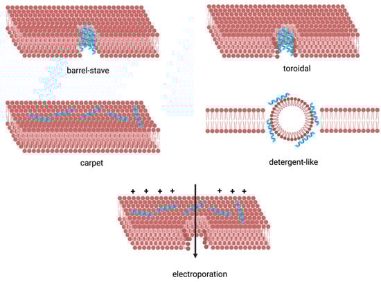 The primary models explaining pore formation by AMPs include the barrel-stave model, toroidal-pore model, carpet model, detergent-like model, and electroporation model (Figure 4).