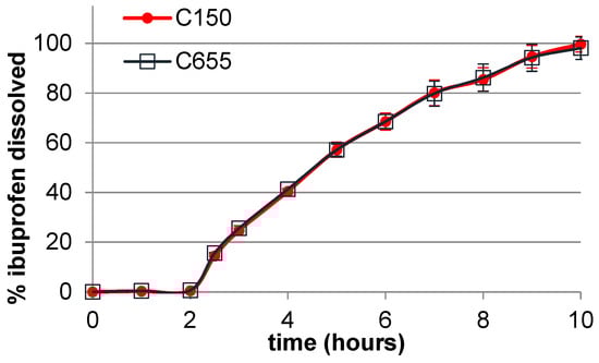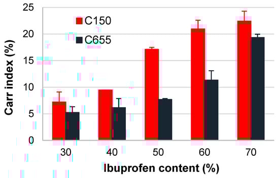 Figure 2 shows the flow properties of the mixtures of co-processed excipients with different ibuprofen contents. Depending on the ibuprofen content, the tested samples showed excellent-to-passable flow [1]. For both co-processed excipients, an increase in the Carr index values was observed with increasing content of this poorly flowable, cohesive API. However, even at the highest ibuprofen content tested (70%), both co-processed excipients provided acceptable flowability of the mixtures, i.e., fair flowability in the case of C655 and passable flowability in the case of C150. The flowability of the mixtures with 70% ibuprofen was comparable to the literature results obtained for directly compressible formulations with the same ibuprofen content but with the commercially available co-processed excipient and additional fumed silica as a glidant [29]. Regardless of the ibuprofen content, the mixtures with C655 showed notably better flow properties than those with C150, which, as mentioned above, can be attributed to the differences in particle size and morphology of the two co-processed excipients.