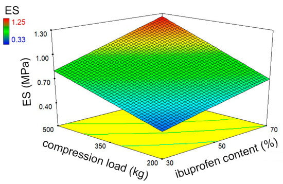 The obtained elastic recovery values are presented in Table 4. Compression load showed the most significant influence on ER, with higher compression pressure leading to higher values of ER (Table 5). Compression speed also showed a significant effect on ER, which was more pronounced at higher ibuprofen content. Higher ER values were observed when compression was performed faster. Ibuprofen is known for its elastic behavior, and the increase in elastic recovery at higher tableting speeds for ibuprofen formulations has also been reported in the literature [49]. It is important to note that high elastic recovery can lead to a reduction in the bonding area, interparticle bonding, and lower tablet strength, while increased elastic recovery in the decompression phase has been associated with higher compression force and speed [50,51]. However, tablet defects associated with excessive relaxation, such as capping, were not observed in any of the samples tested.