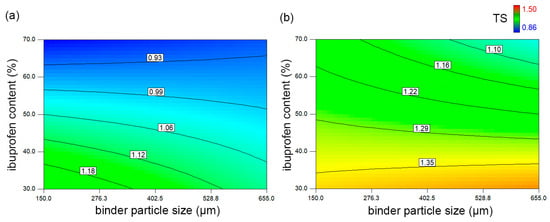 The tensile strength values obtained for the investigated samples indicate a high dilution potential of the investigated co-processed excipients (Table 4). Considering the well-known poor compaction properties of ibuprofen and the fact that most of the tested samples, including some with 70% ibuprofen, exhibited a TS above 1 MPa, which is considered an acceptable mechanical strength, the results obtained are quite promising [44,52]. The factors that showed a statistically significant effect on tensile strength include ibuprofen content, compression load and the interaction between binder particle size, ibuprofen content, and compression load. Ibuprofen content had a negative effect on tensile strength, which was expected considering its poor compactibility. However, it can be observed that at higher compression pressure, all tablets exhibited a TS higher than 1 MPa regardless of ibuprofen content. The results also show that at higher ibuprofen content, the difference in mechanical properties of tablets prepared with two co-processed excipients becomes more prominent at higher compression loads (Figure 4). Although both co-processed excipients can provide acceptable mechanical properties at 70% ibuprofen content, a higher TS value can be achieved with C150 as its particles are smaller, and therefore a larger surface area is available for bonding between the particles.
