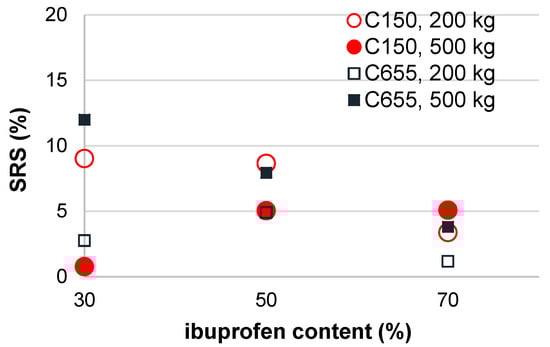 It is well described in the literature that compression speed can influence the mechanical properties of tablets, with higher compression speeds being associated with a decrease in compact tensile strength. Such behavior is particularly observed in materials prone to plastic and/or elastic deformation [53]. Considering the increasing production rates of modern tableting machines, it is of utmost importance to investigate the influence of compression speed on tablet properties in order to avoid serious tablet defects that might occur during the scale-up process due to the increased production speed. Interestingly, the compression speed did not show a significant effect on the tensile strength of the tablets prepared with ibuprofen and our co-processed excipients. This is further depicted by the values of the SRS indices, which are well below 10% in the case of C150 and equal to or below 12% in the case of C655, which can be regarded as a relatively low sensitivity to changes in compression speed [54,55]. Interestingly, it can be observed that for 70% ibuprofen, the differences in SRS indices determined for two co-processed excipients at the same compression pressure are even smaller and none of the values exceeded 5% (Figure 5). This is particularly promising considering that the formulations studied contain a high content of ibuprofen, which is known to undergo both plastic and elastic deformation during compression [53]. Furthermore, the influence of compression speed on ER observed in this study and the viscoelastic properties of ibuprofen described in the literature underline the importance of the acceptable mechanical properties observed.