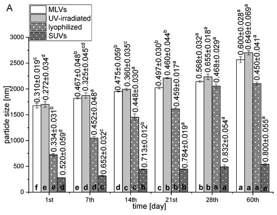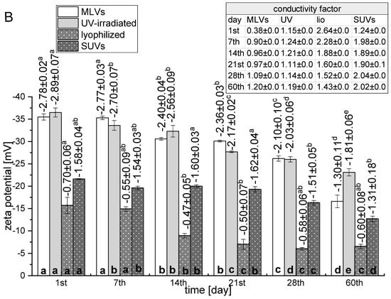 Particle size bars and polydispersity index numbers above bars (A) and zeta potential-bars, mobility-numbers above bars [µmcm/Vs], and conductivity-table (B) of multilamellar liposomes (MLVs), UV-irradiated liposomes, lyophilized liposomes, and small unilamellar liposomes (SUVs) with encapsulated silibinin monitored for 60 days of their storage at 4 °C; values with the same letter showed no statistically significant difference (p > 0.05; n = 3; analysis of variance, Duncan’s post hoc test).