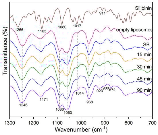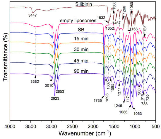 As can be seen from Figure 4, sonication did not cause changes in the FTIR spectra of silybin-loaded liposomes. Although ultrasound waves can affect the physical and structural characteristics of liposomes, the degree of the changes depends on ultrasound parameters []. In the case of liposomes with silibinin, the sonication period was short (15 min) and included pauses in sonication, which probably prevented the degradation of the bilayer caused by cavitation with a desired reduction in particle size. A prolonged time of ultrasound exposure can show the phase change expanding effect of the phospholipid membrane, and, consequently, chemical and physical changes [].