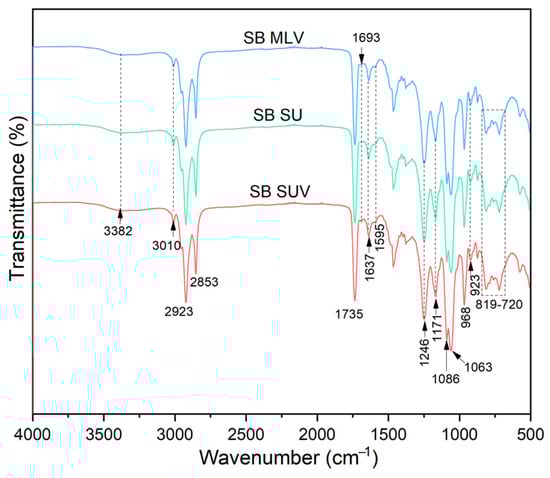 FT-IR spectra of silibinin-loaded liposomes: multilamellar liposomes (MLV), UV-irradiated liposomes, and small unilamellar liposomes (SUV).
