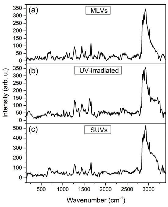Raman spectroscopy was applied to investigate the presence of various interactions between silibinin, Ph, liposomes with loaded silibinin, and liposome UV-irradiated and sonicated counterparts. The Raman spectra of pure silibinin and Ph are presented in the Supplementary Materials (Figure S1), while the Raman spectra of MLVs, UV-irradiated liposomes, and SUVs with encapsulated silibinin (all lyophilized samples due to device requirements) are shown in Figure 5.