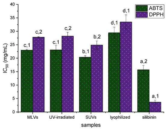 The encapsulation of biologically active components represents a technique that has been widely used in the food, pharmaceutical, and cosmetic industries to strengthen and supplement formulations by enhancing stability and bioavailability and controlling the delivery of active compounds [,,,]. Liposomes, as spherical micro- or nanoparticles formed by one or multiple phospholipid layers, are widely used as carriers for delivering drugs, antioxidants, proteins, enzymes, polyphenols, vitamins, flavors, and aromas, due to their non-toxicity, biodegradability, and ability to encapsulate hydrophilic, amphiphilic, and lipophilic compounds [,,,,]. Liposomes can provide a controlled release of biologically active compounds, as well as aiding their protection from modification and degradation caused by light, oxygen, UV irradiation, free radicals, enzymes, changes in pH values, etc. [,]. Additionally, several studies have shown that liposomes provide a higher bioavailability of various compounds, including drugs, proteins, nutraceuticals, and polyphenols, due to their lipid composition being similar to that of epithelial cells [,,,]. The liposomal particles can be formulated using the common thin film hydration procedure, micro-emulsification, membrane extrusion, proliposome method, ether or ethanol injection, a reverse phase evaporation method, etc. [,,]. Among all the previously mentioned techniques, the proliposome technology may be suitable for large-scale production []. Additionally, the sonication and cavitation effects can increase the dispersion of lipid molecules, consequently, reducing the particle size of the lipid droplets; thus, the mentioned process is widely employed for obtaining small unilamellar liposomes [,,]. Liposomal vesicle size displays an important influence on the delivery and penetration of encapsulated compounds through the skin, as well as the efficiency of the applied formulation []; thus, that was one of the criteria for choosing modification methods during liposome development. Since UV irradiation is used in the food, pharmaceutical, and cosmetic industries as a sterilization technique, and can enhance the release of active compounds from the liposomes and cause changes in the physicochemical properties of the liposomes, its influence should be investigated as well []. Also, the potential application of silibinin-loaded liposomes for the dermal and transdermal delivery of silibinin and, consequently, exposure of the formulation to UV rays from the sun, significantly affected the selection of this specific liposome modification technique. Lyophilization (freeze drying), as a simple and frequently employed procedure for drying thermosensitive components, uses freezing and low pressure with the addition of heat (only to cause the sublimation of ice) and can be applied to liposomal vesicles. Namely, the obtained lyophilized products with active compounds (e.g., polyphenols) are stable over a long period, due to the prevention of hydrolytic and oxidative degradation, which can occur in the surrounding water [,,]. Considering that liposomal formulation can contain between 70 and 95% of the water phase, hydrolytic and oxidative reactions, as well as microbiological contamination (which occurs in an aqueous medium), are frequent causes of products’ degradation and spoilage and their short shelf life. With the aim to improve storage stability and provide prolonged shelf life of the liposomal preparations, freeze drying can be used as a simple preservation procedure. However, the lyophilization process can result in significant modifications of the liposomal particles; thus, its effect should be examined as well. Hence, due to all mentioned above related to lyophilization, this process was selected as one of the methods that could potentially have positive or negative impacts on liposome characteristics and bioactivities.