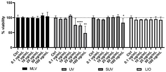 The stock solution of liposomes with silibinin (MLVs, SUVs, UV-irradiated, and lyophilized samples with silibinin and unloaded MLVs) was prepared, at a concentration of 10 mg/mL and kept at 4 °C. For the experiment, final concentrations of each treatment were prepared from the stock solution by dissolving in fresh complete cell medium to reach final concentrations of 0.1, 1, 10, 25, 50, and 100 µg/mL. These concentrations were further used for cell treatments.