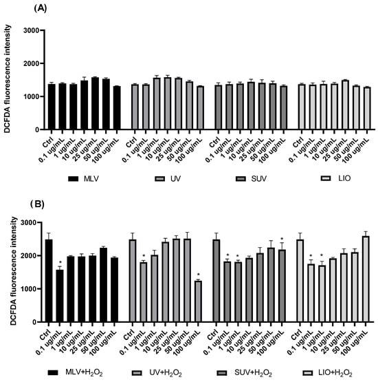 HaCaT cells were left overnight to attach to the wells and kept in a humified incubator at 5% CO2 and 37 °C. The next day, the medium was exchanged and silibinin-loaded liposomes (MLVs, SUVs, UV-irradiated, and lyophilized samples) or empty MLVs at final concentrations (0.1, 1, 10, 25, 50, and 100 µg/mL) in complete medium were added to the cells (100 μL per well). After 24 h, treatments were removed, and cells were rinsed with PBS. Next, the assay was performed in line with the manufacturer’s instructions []. Using PBS as the diluent, 5 μM of the cell-permeable oxidation-sensitive probe, H2DCFDA was added to the cells and left for 45 min in the dark. Next, the cells were washed with PBS and exposed to PBS alone (control) or the 200 μM H2O2, used as the positive control. After an incubation time of 2 h, and the conversion of non-fluorescent H2DCFDA to the highly fluorescent 2′,7′-dichlorofluorescein (DCF), the generation of intracellular ROS (reactive oxygen species) level in cells was determined by measuring the fluorescence on a fluorescent plate reader (Wallac 1420 multilabel counter Victor 3V, PerkinElmer Life and Analytical Sciences, Boston, MA, USA) at excitation and emission wavelengths of 485 and 535 nm, respectively. Data were expressed as relative fluorescence intensity and the mean value was represented in figures, from three independent experiments performed in triplicate (n = 9).