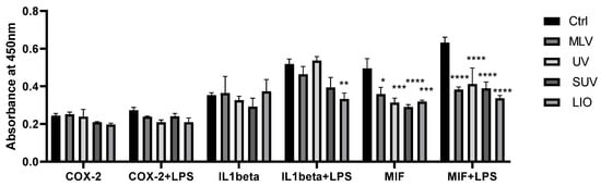 Analysis of the anti-inflammatory potential of the obtained liposomal samples was performed using cell-based ELISA according to the previously described method []. Namely, HaCaT cells were seeded in 96-well plates at a density of 2 × 105 cells per well and grown for 24 h at 37 °C and 5% CO2. The following day, the medium was replaced with treatments containing MLVs, SUVs, UV-irradiated, and lyophilized samples or empty MLVs at a final concentration of 10 µg/mL in a complete medium and incubated for 24 h with the cells. At the end of the treatment, the medium was removed, and the cells were exposed to 2.5 µg/mL of LPS in a complete medium for 4 h at 37 °C and 5% CO2. Afterwards, cells were washed twice with PBS and the plate was dried. After drying, the cells were fixed with ice-cold acetone-methanol (1:1) for 10 min. Next, endogenous peroxidases were blocked by adding 0.3% H2O2, 100 μL per well for 30 min in the dark. Then, the wells were washed with PBS and blocked with the addition of 1% BSA in PBS for 30 min at 37 °C. After blocking, 50 μL of each primary antibody (PA5-27238, source: rabbit, 1:500, Invitrogen, Waltham, MA, USA) for interleukin 1 beta (IL-1β), macrophage inhibitory factor (MIF), or cyclooxygenase-2 (COX-2) was added in PBS with 1% BSA to the wells and incubated 2 h at room temperature. Following the incubation with antibodies, the plate was washed three times with PBS containing 0.5% Tween, and a secondary antibody (1:2000, anti-rabbit IgG, HRP-linked Antibody 7074P2, Cell Signaling Technology, Danvers, MA, USA; or 1:2000, anti-mouse IgG, HRP-linked Antibody 7076S, Cell Signaling Technology, Danvers, MA, USA) in PBS with 1% BSA was added to the wells and incubation lasted 2 h at room temperature. Finally, the plate was washed three times with PBS, 50 μL of substrate was added to each well, and color development was monitored. When the color developed, 50 μL of the stop reagent was added and the plate was read at 450 nm wavelength on a plate reader (ELx800, BioTek, Shoreline, WA, USA).