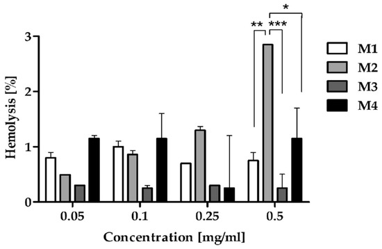 Hemolytic activity of the synthesized biodegradable polymers: M1, M2, M3, and M4 after 1 h of incubation. The graph depicts the level of hemolysis of RBC treated with increasing concentrations of the complex after 1 h of treatment. Two-way ANOVA followed by the Bonferroni post-test was used for statistical analysis. The results were considered statistically significant: * p < 0.05; ** p < 0.01; *** p < 0.005.