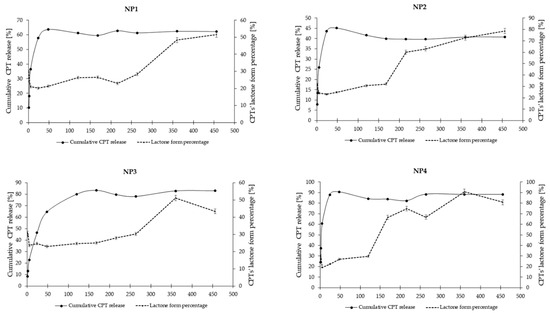 2.6. In Vitro Release Study of CPT from the Developed Nanosystems
