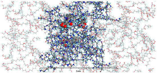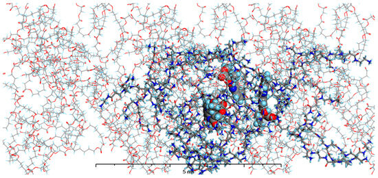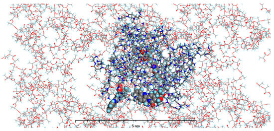 The structure of MODEL 4—PAMAM dendrimer generation 4.0 loaded with three molecules of CPT and surrounded by PGACL 90:10 (ε-CL:GL) matrix. Atom coloring: Hydrogen—light blue, Nitrogen—dark blue, Carbon—grey, Oxygen—red. Rendering: the atoms and bonds of PLLA are rendered as sticks, the atoms of PAMAM dendrimer generation 4.0 are rendered as solid cylinders, CPT atoms are rendered as spheres with radii that are related to the van der Waals radii of its atoms.