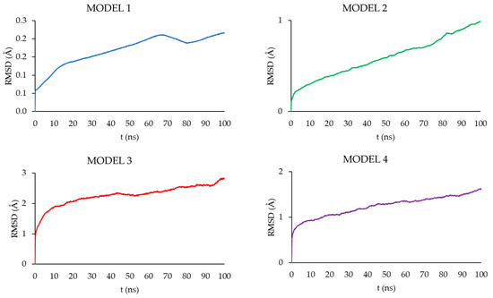 RMSD plots obtained for CPT in MODELS 1–4 during 100 ns MD simulation.