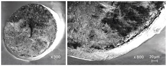 SEM images of a cross-section of RVX multiparticulates (magnification ×300 on the left, ×800 on the right).